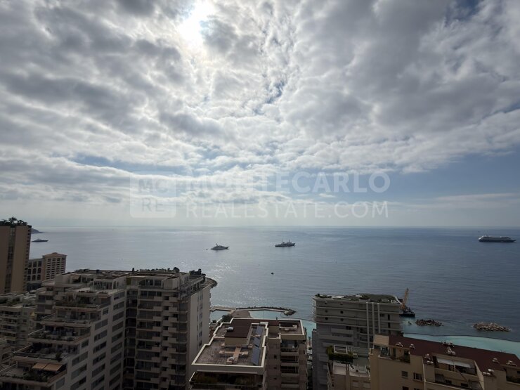 Superbe appartement 3 pièces en étage élevé, offrant une vue mer panoramique exceptionnelle, idéalement situé à deux pas des plages du Larvotto et...