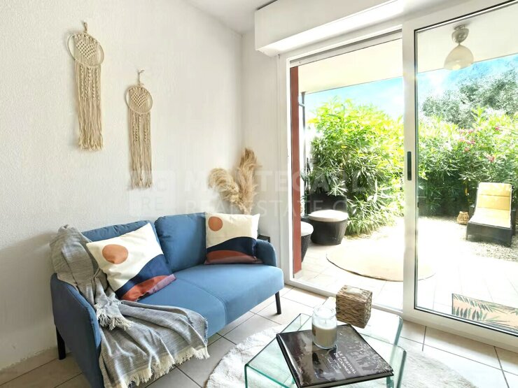 D'une superficie habitable de 50 m2, il se compose d'une entrée, un séjour ouvert sur une terrasse couverte donnant sur un jardinet, une cuisine américaine équipée, une terrasse couverte avec vue mer, une chambre lumineuse, un bureau et une salle de bains avec toilettes.
