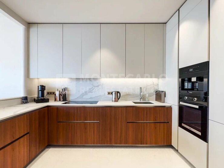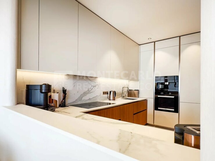 Bienvenue dans la résidence L'Exotique, dont le lobby donne déjà le ton d'un habitat luxueux. Des revêtements en bois précieux, des luminaires élégants, des sièges confortables et des détails raffinés créent une atmosphère accueillante et offrent un premier aperçu du haut niveau et du design exquis de l'ensemble du bâtiment. Vous bénéficiez également d'un service de conciergerie 24h/24 et 7j/7, d'une salle de fitness, d'un espace spa avec piscine intérieure et hammam. Un parc privé, appartenant à l'immeuble et planté de nombreux oliviers, vous offre une vue impressionnante sur la Méditerranée et la Principauté. Ce magnifique appartement de trois pièces offre une vue imprenable sur la mer. Grâce à son orientation sud-ouest, l'appartement bénéficie d'un ensoleillement optimal et impressionne par son design de qualité. L'appartement dispose d'un élégant double salon et d'une élégante cuisine entièrement équipée d'appareils de première classe. Le salon s'ouvre sur une terrasse spacieuse où une grande table à manger invite à des soirées conviviales. Un espace salon supplémentaire crée une atmosphère de calme et de détente pour vous et vos invités. La chambre à coucher principale impressionne par sa taille, sa lumière naturelle et son dressing-couloir qui offre de nombreuses possibilités de rangement, ce qui ravira particulièrement les femmes. La salle de bain en suite avec chauffage au sol est équipée de carreaux de pierre, d'un double lavabo sur mesure, d'une baignoire et d'une douche. Une deuxième chambre avec salle de douche offre également des matériaux de qualité et un design moderne.