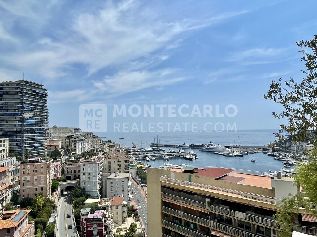 L’espace de réception se compose d’un double séjour élégant, réunissant salon et salle à manger, prolongé par une vaste terrasse baignée de lumière naturelle. De là, s’offre un panorama unique et spectaculaire sur la mer et le port Hercule, l’un des plus beaux cadres de Monaco.