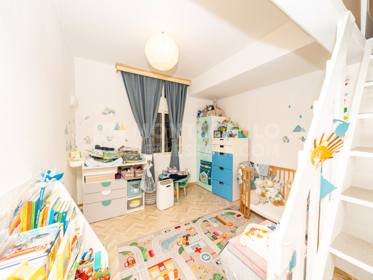 L’appartement se compose d’un salon avec cuisine ouverte donnant sur une vaste terrasse et une spacieuse loggia, de deux chambres, dont une avec mezzanine idéale comme espace de jeux pour enfants ou de rangement, de deux salles de bains et d’un toilette invité.