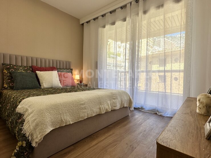 Cet appartement de 2 pièces, très fonctionnel, dispose d'une entrée avec placards, d'un salon, d'une cuisine indépendante équipée, d'un toilette invités, d'une chambre avec salle de douche avec water closet ensuite, et d'un grand balcon filant accessible depuis les deux pièces. Les finitions soignées incluent du marbre au sol, du parquet sur le balcon et des portes en bois. De nombreux rangements sont intégrés. Rénové et meublé, prêt à vivre. Ce bien comprend également une cave numéro 251 au deuxième sous-sol et un parking numéro 114 au premier sous-sol. Ne manquez pas cette opportunité unique au cœur de Monaco.