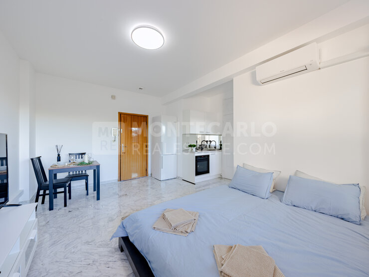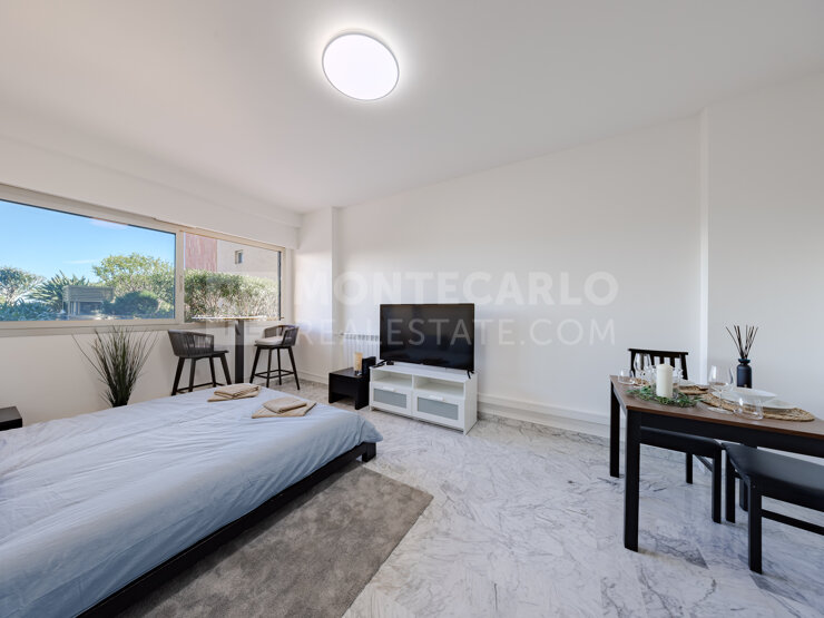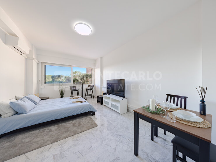 Spacieux appartement de 36m² situé dans l’immeuble "Le Shangri-La", en excellent état. Ce bien comprend une salle d’eau avec baignoire et WC séparé, un coin cuisine entièrement équipé neuf, de grands placards intégrés, ainsi qu’une large fenêtre offrant une vue imprenable sur la ville et le port. Il est également équipé d'un système d'air conditionné réversible. Très lumineux, cet appartement bénéficie d'une belle exposition. La résidence, idéalement située face au port, dispose également d'un service de sécurité pour assurer votre tranquillité.
