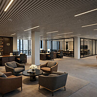 Enveloppés par des nuances de bleu clair, gris et marron, avec vue sur le quartier de Fontvieille et le Boulevard Charles III, ce bureau séparé par des cloisonnements en verre.