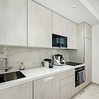 Al piano terra: un maestoso ingresso, un doppio soggiorno, una cucina completamente attrezzata e un bagno per gli ospiti. Un ascensore interno consente di accedere direttamente al 1° livello.