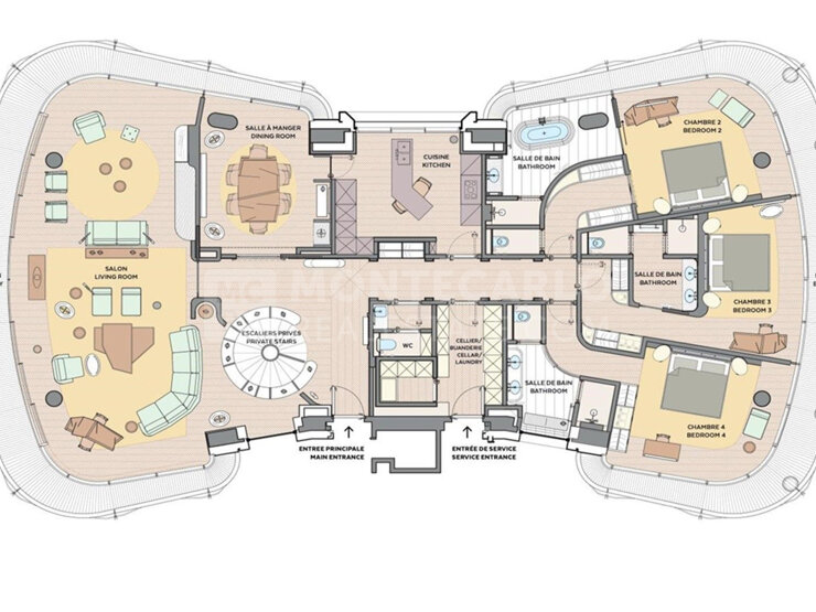 Magnifique duplex, entouré de balcons, entièrement meublé et décoré, de 410 m², avec des vues imprenables sur le Rocher et la mer. À l'étage principal : un hall d'entrée, un salon, une salle à manger, une cuisine équipée, 3 chambres avec salles de bains et dressings, buanderie, toilettes invités et entrée de service. À l'étage inférieur : une suite parentale avec salle de bain et deux dressings. 3 places de parking et un local de stockage. Libre - Bail de 2 ans minimum.